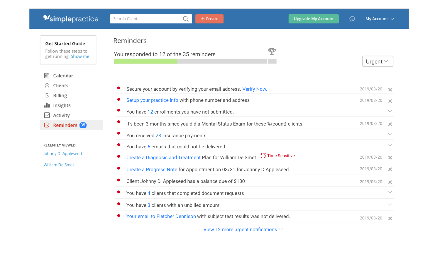 Simple Practice has a feature called reminders that are broken up into two categories, notifications and ToDo list. Reminders are getting ignored and piling up. Users don’t have control to turn them off.